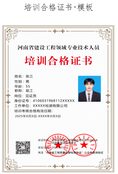 完成全部培訓課程并通過考核的人員,河南省建設工程質量監(jiān)督檢測行業(yè)協(xié)會、河南省建設監(jiān)理協(xié)會聯(lián)合發(fā)放見證員、送樣員、取樣員培訓合格電子證書,該證書可作為從業(yè)人員上崗和執(zhí)業(yè)的資格證明。、