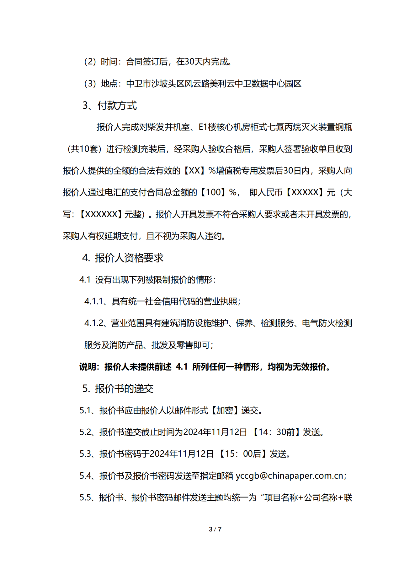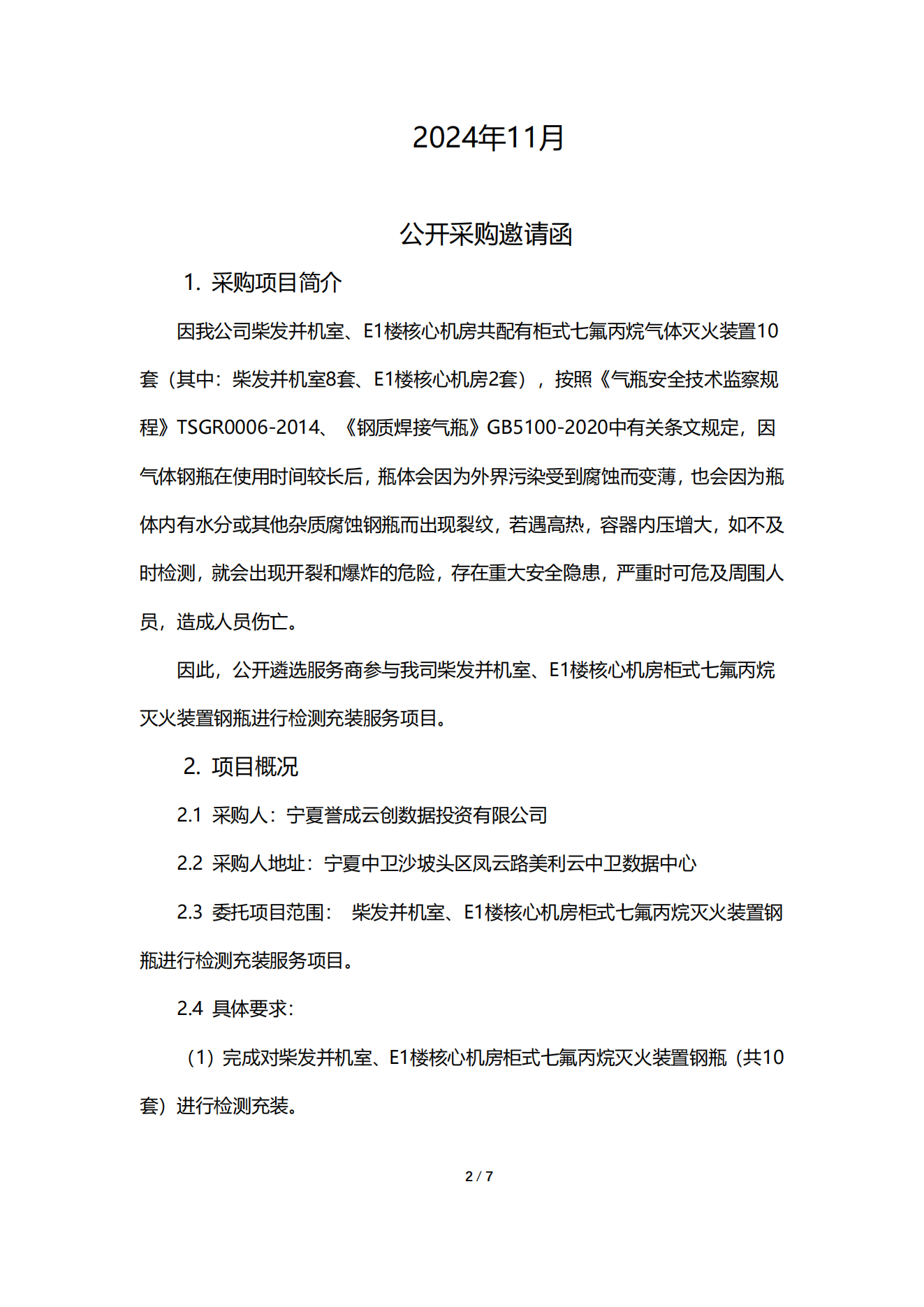 寧夏譽(yù)成云創(chuàng)數(shù)據(jù)投資有限公司(簡稱“譽(yù)成云創(chuàng)”),美利云中衛(wèi)數(shù)據(jù)中心柴發(fā)并機(jī)室、E1樓核心機(jī)房共配有柜式七氟丙烷氣體滅火裝置10套(其中:柴發(fā)并機(jī)室8套、E1樓核心機(jī)房2套),按照《氣瓶安全技術(shù)監(jiān)察規(guī)程》TSGR0006-2014、《鋼質(zhì)焊接氣瓶》GB5100-2020中有關(guān)條文規(guī)定,因氣體鋼瓶在使用時間較長后,瓶體會因為外界污染受到腐蝕而變薄,也會因為瓶體內(nèi)有水分或其他雜質(zhì)腐蝕鋼瓶而出現(xiàn)裂紋,若遇高熱,容器內(nèi)壓增大,如不及時檢測,就會出現(xiàn)開裂和爆炸的危險,存在重大安全隱患,嚴(yán)重時可危及周圍人員,造成人員傷亡。 因此,公開遴選服務(wù)商參與我司柴發(fā)并機(jī)室、E1樓核心機(jī)房柜式七氟丙烷滅火裝置鋼瓶進(jìn)行檢測充裝服務(wù)項目。??采購信息詳見附件【關(guān)于《寧夏譽(yù)成云創(chuàng)數(shù)據(jù)投資有限公司柴發(fā)并機(jī)室、E1樓核心機(jī)房柜式七氟丙烷滅火裝置鋼瓶進(jìn)行檢測充裝服務(wù)項目》采購文件】。